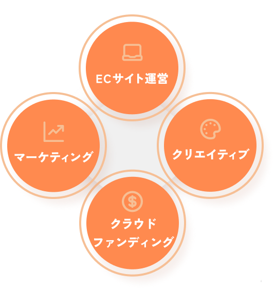 「EC運営」「マーケティング」「クリエイティブ」「クラウドファンディング」の4つの軸でEC事業の成長をご支援しています。